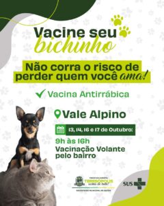 Até sexta-feira, 24 de outubro, a equipe do Setor de Controle de Zoonoses, da Secretaria Municipal de Saúde, estará em Imbiú, no 3º Distrito, das 9h às 16h, vacinando cães e gatos contra a raiva animal. Os pets deverão ser conduzidos pelos tutores maiores de 18 anos, que ficam responsáveis pela contenção