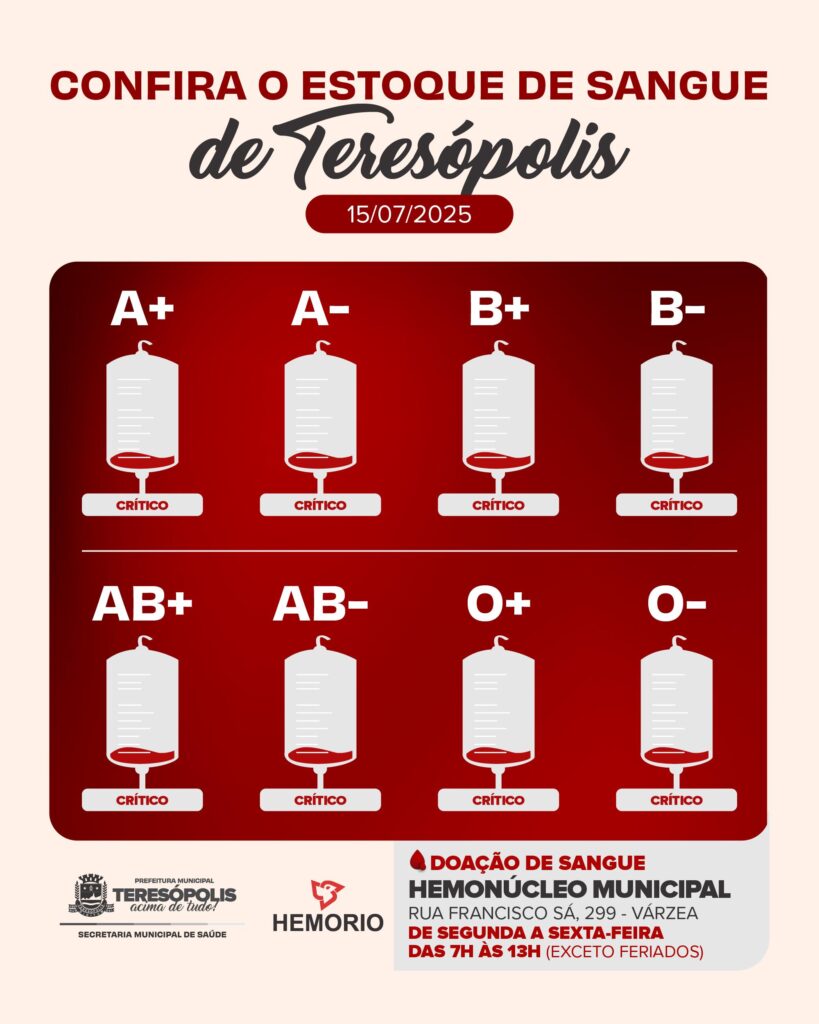 O Hemonúcleo de Teresópolis necessita com urgência da doação de todos os tipos de sangue, pois o estoque encontra-se em nível crítico, e convida todos os doadores e potenciais doadores para comparecerem à unidade, a fim de fortalecer essa corrente de solidariedade.