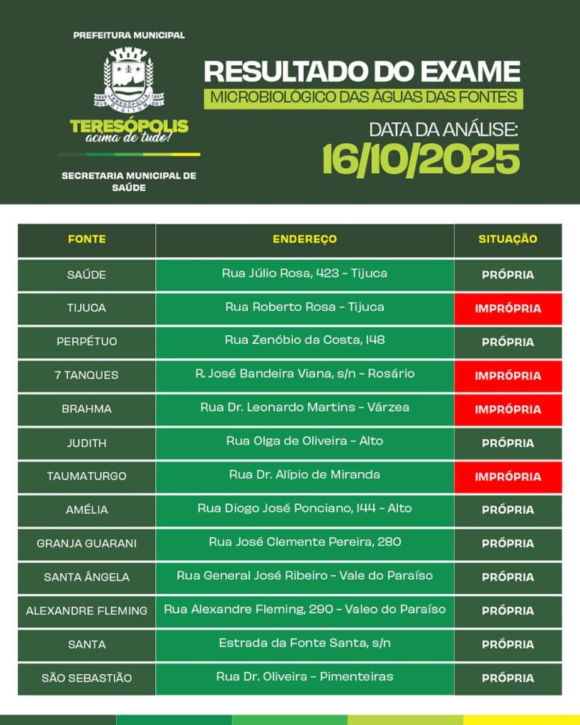 A Secretaria Municipal de Saúde divulgou o resultado do exame microbiológico da qualidade da água, realizado na última quinta-feira, 16, em 13 fontes da cidade. Pelas amostras coletadas e analisadas pelo Laboratório Bacteriológico de Análise de Água para Consumo Humano, da Secretaria Municipal de Saúde, as fontes Brahma, Taumaturgo, Tijuca e 7 Tanques estão impróprias para consumo.